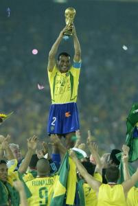 Yokohama, 30 giugno 2002 - Marcos Evangelista de Morais Cafu, capitano del Brasile e primo calciatore della storia a giocare tre finali mondiali, alza la Coppa del Mondo